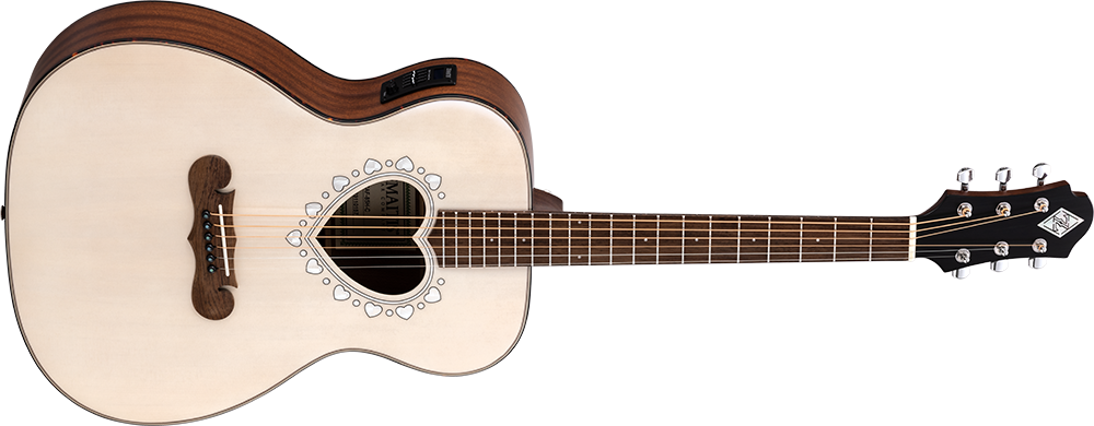 CAF-85H-Cは、人気のハート・サウンドホールを有するオーケストラ・モデル、CAF-85HCW-Cはそのカッタウェイ・タイプで、マザー・オブ・パール柄のロゼッタを採用し、アンティーク・フィニッシュのオフホワイトのボディー・トップとの白を基調とした組み合わせは、chayらしいセレクトで、柔らかな印象を与えます。